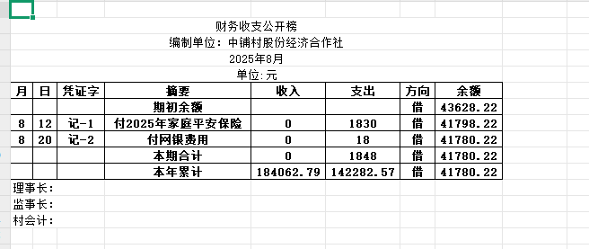 阿城镇中铺村2025年8月份账目收支明细表