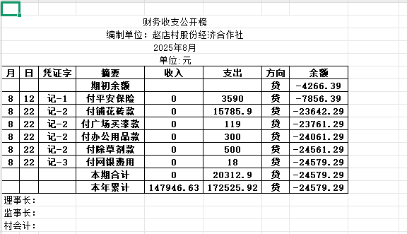阿城镇赵店村2025年8月份账目收支明细表