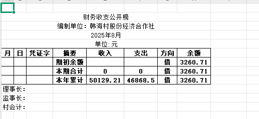 阿城镇韩海村2025年8月份账目收支明细表
