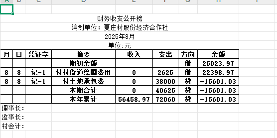 阿城镇夏庄村2025年8月份账目收支明细表