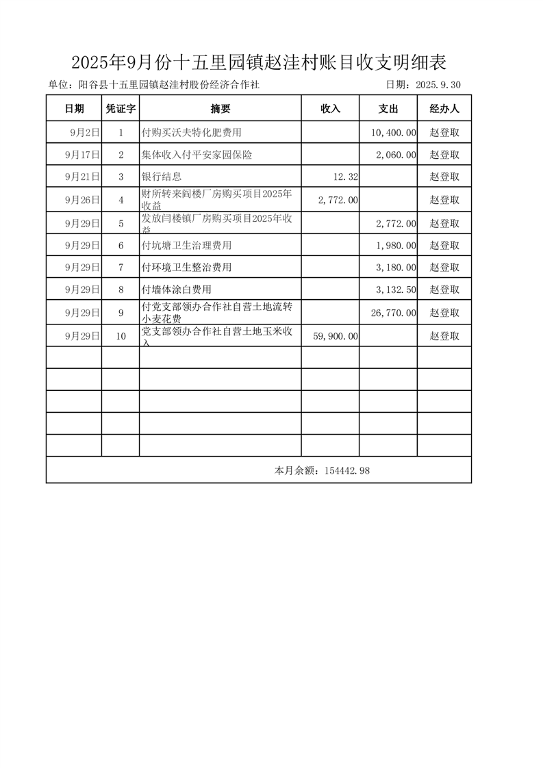 2025年9月份十五里园镇赵洼村账目收支明细表
