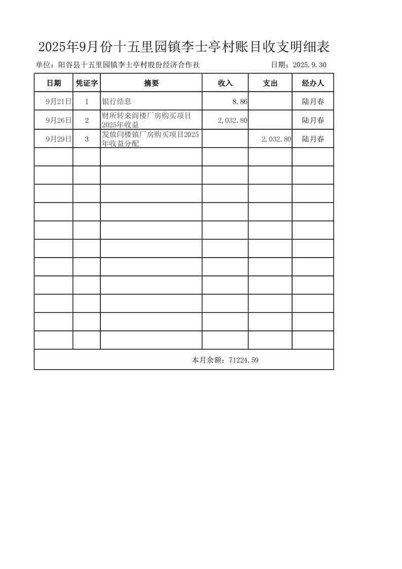 2025年9月份十五里园镇李士亭村账目收支明细表