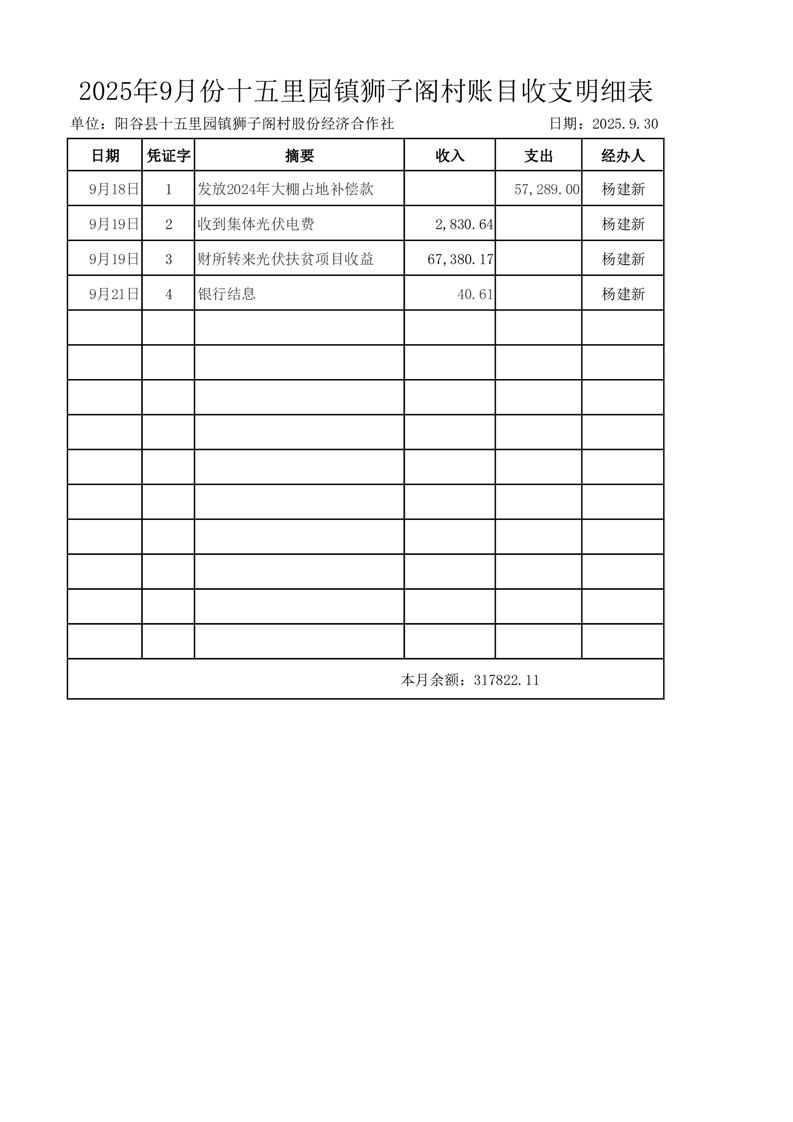 2025年9月份十五里园镇狮子阁村账目收支明细表