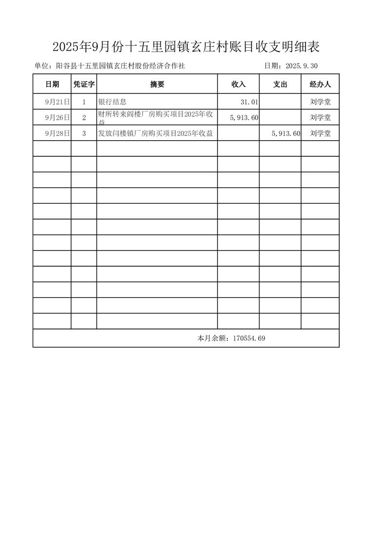 2025年9月份十五里园镇玄庄村账目收支明细表
