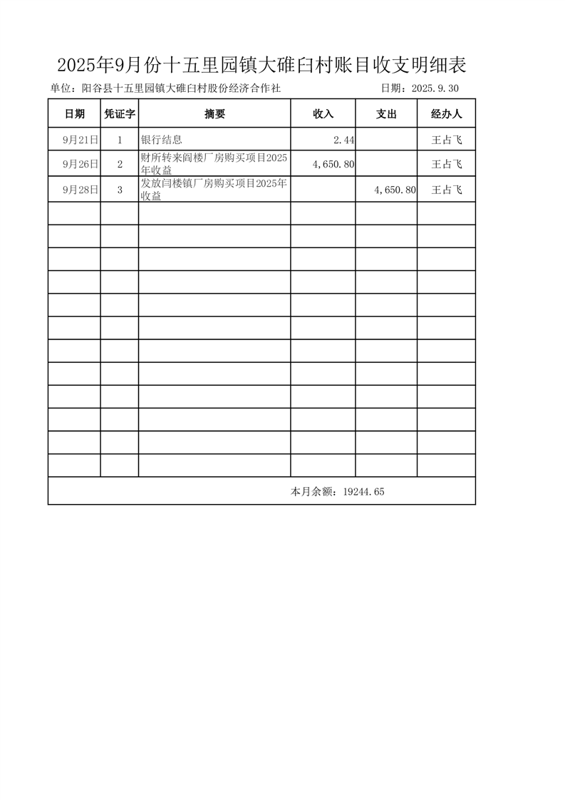 2025年9月份十五里园镇大碓臼村账目收支明细表