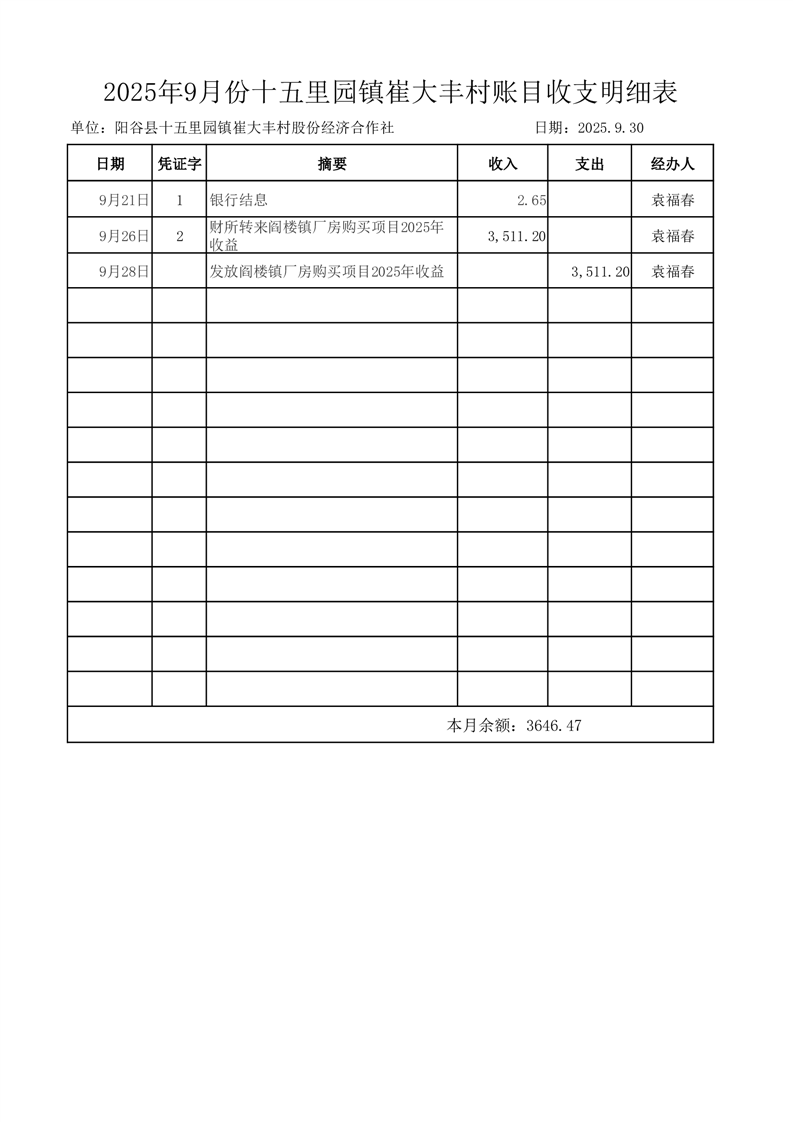 2025年9月份十五里园镇崔大丰村账目收支明细表