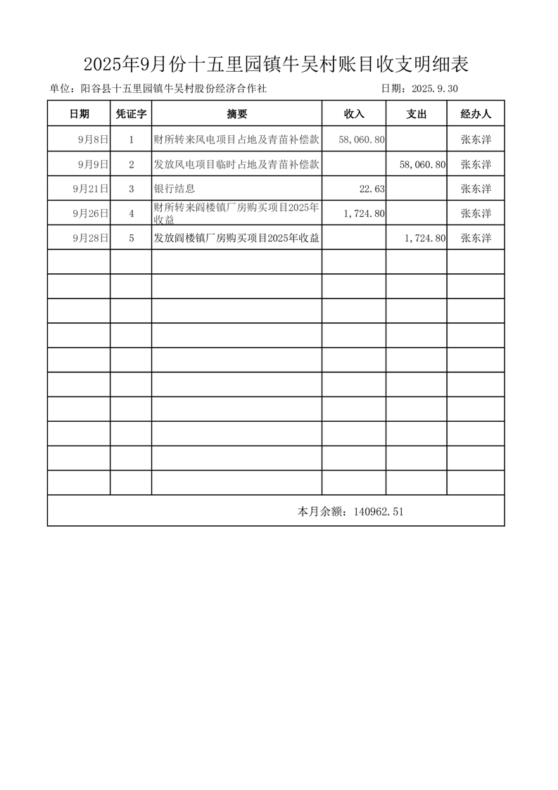 2025年9月份十五里园镇牛吴村账目收支明细表