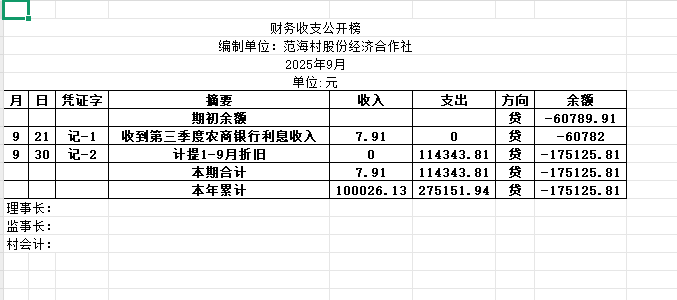 阿城镇范海村2025年9月份账目收支明细表