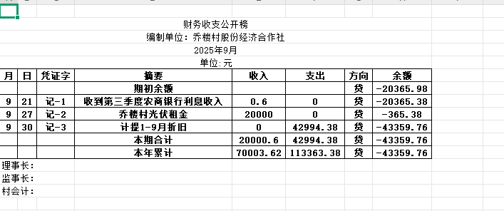 阿城镇乔楼村2025年9月份账目收支明细表