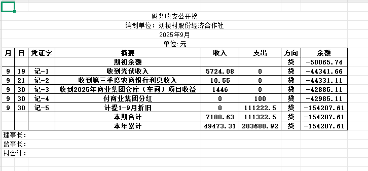 阿城镇刘楼村2025年9月份账目收支明细表