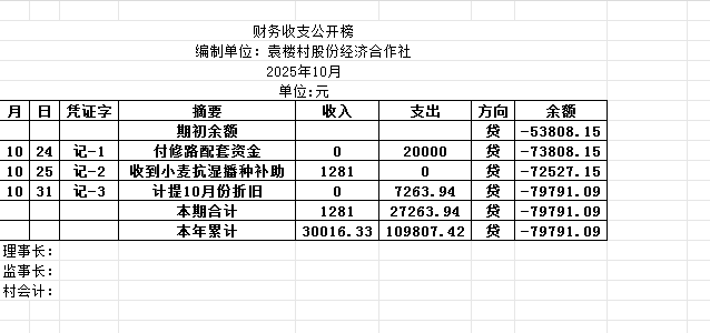 阿城镇袁楼村2025年10月份账目收支明细表