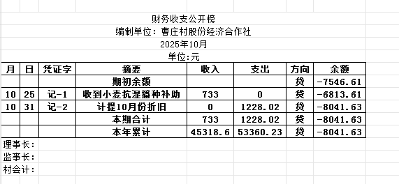 阿城镇曹庄村2025年10月份账目收支明细表