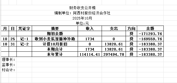 阿城镇阿西村2025年10月份账目收支明细表
