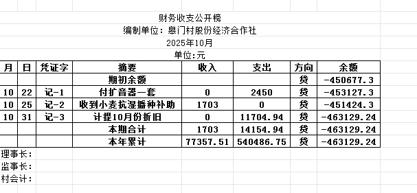 阿城镇皋门村2025年10月份账目收支明细表