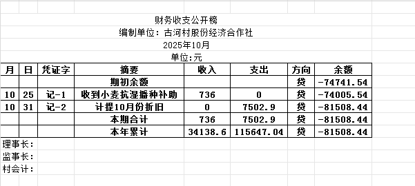 阿城镇古河村2025年10月份账目收支明细表