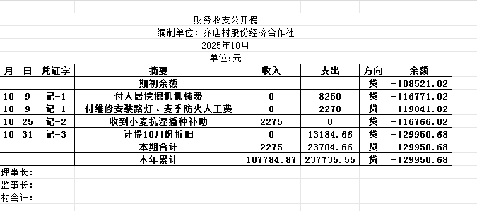 阿城镇齐店村2025年10月份账目收支明细表