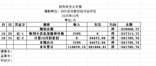 阿城镇刘什庄村2025年10月份账目收支明细表