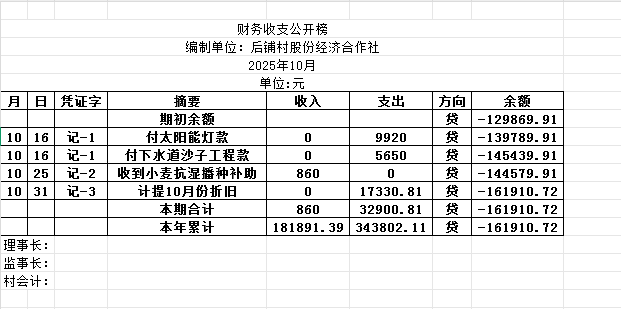 阿城镇后铺村2025年10月份账目收支明细表