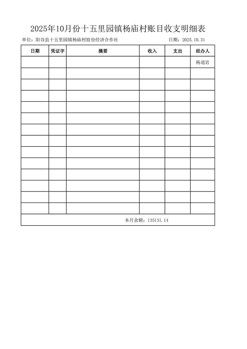 2025年10月份十五里园镇杨庙村账目收支明细表