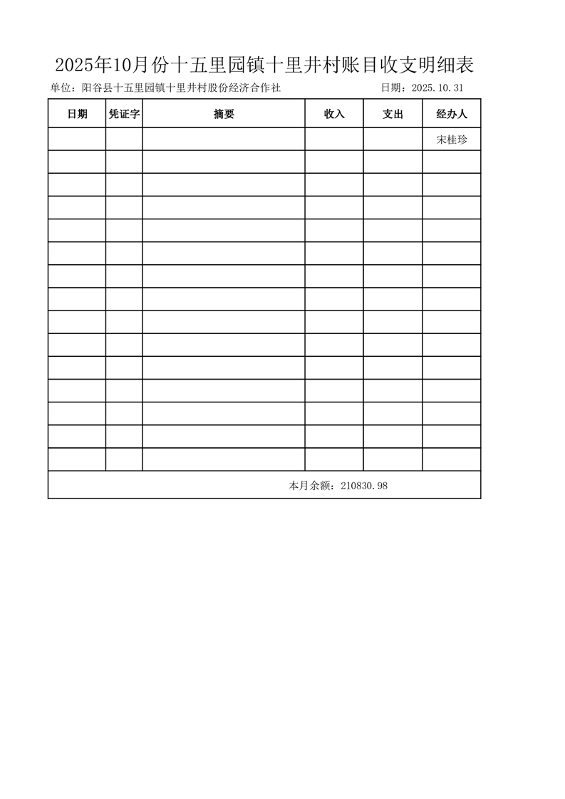 2025年10月份十五里园镇十里井村账目收支明细表