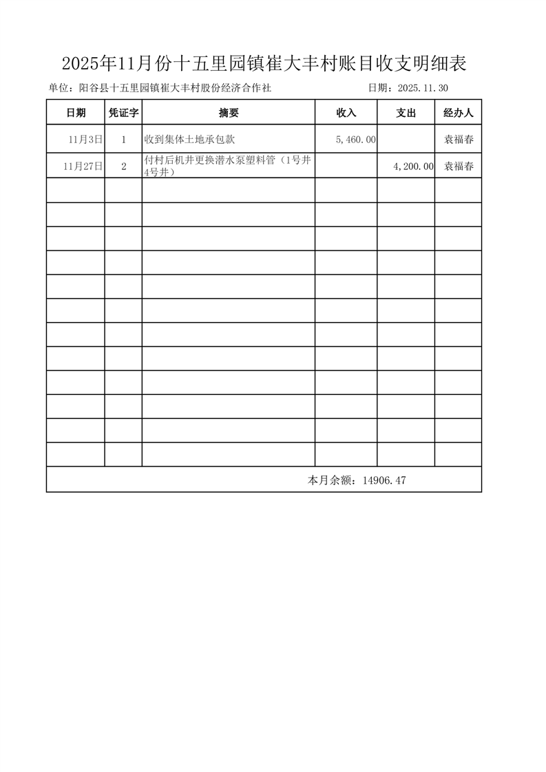 2025年11月份十五里园镇崔大丰村账目收支明细表