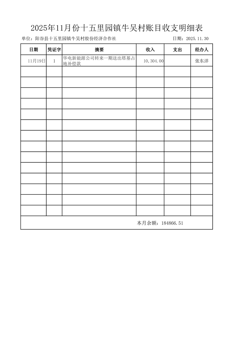 2025年11月份十五里园镇牛吴村账目收支明细表
