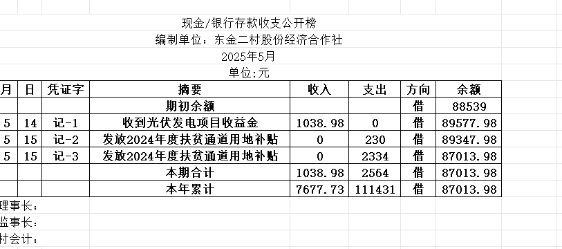 阳谷县金斗营镇东金二村资金公开明细表2025.05