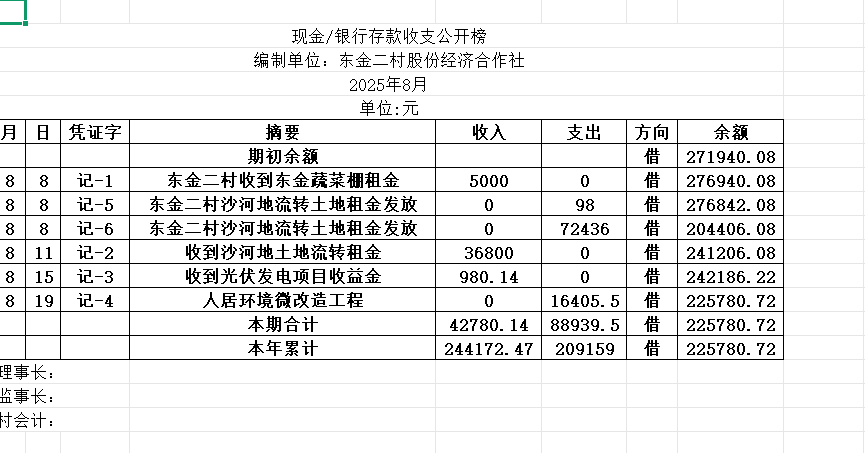 阳谷县金斗营镇东金二村资金公开明细表2025.08