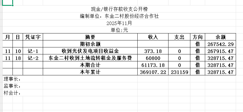 阳谷县金斗营镇东金二村资金公开明细表2025.11