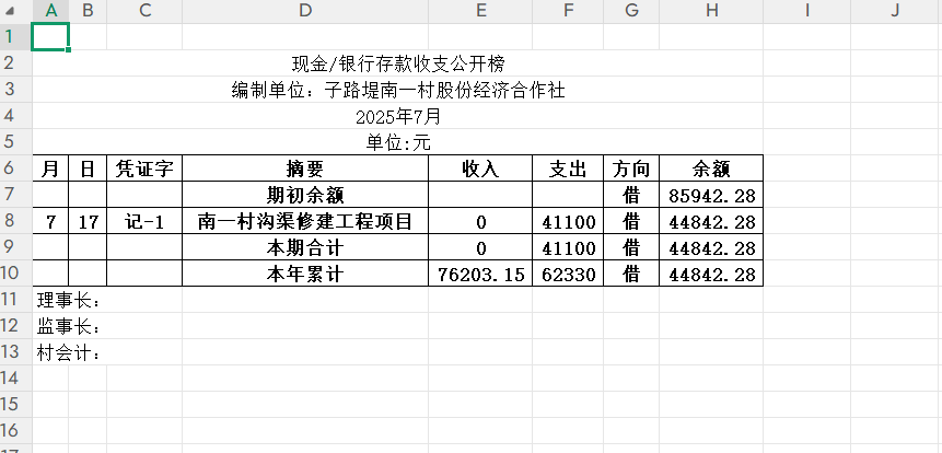 阳谷县金斗营镇子南一村资金公开明细表2025.07