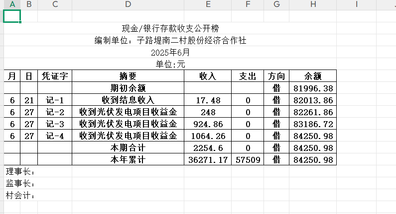 阳谷县金斗营镇子南二村资金公开明细表2025.06