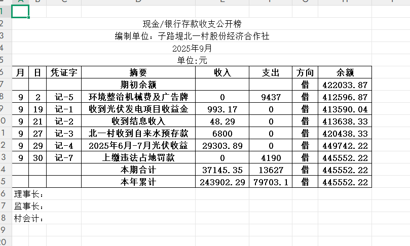 阳谷县金斗营镇子北一村资金公开明细表2025.09