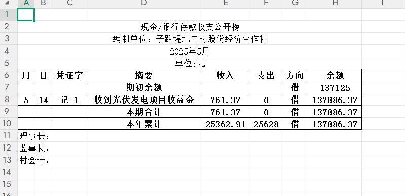 阳谷县金斗营镇子北二村资金公开明细表2025.05