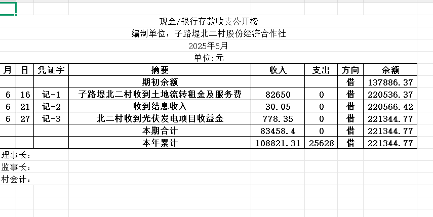 阳谷县金斗营镇子北二村资金公开明细表2025.06