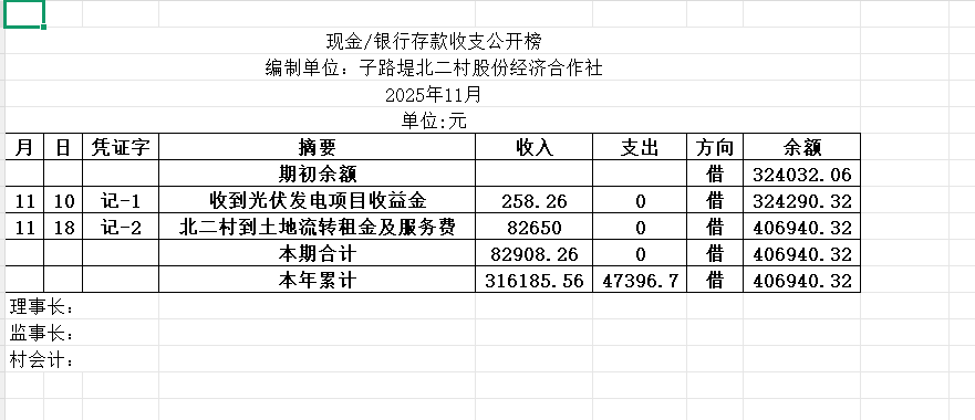 阳谷县金斗营镇子北二村资金公开明细表2025.11