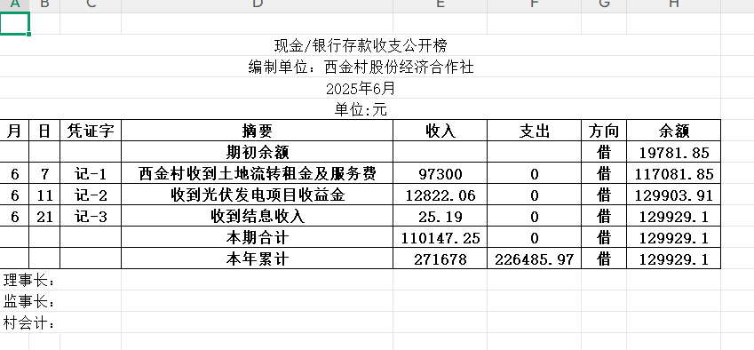 阳谷县金斗营镇西金村资金公开明细表2025.06