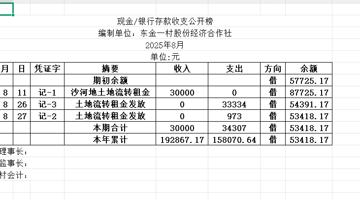 阳谷县金斗营镇东金一村资金公开明细表2025.08