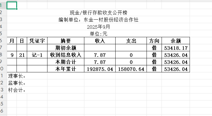 阳谷县金斗营镇东金一村资金公开明细表2025.09