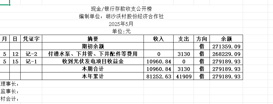 阳谷县金斗营镇胡沙沃村资金公开明细表25.05