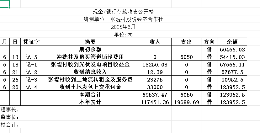 阳谷县金斗营镇张堤村资金公开明细表25.06