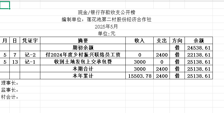 阳谷县金斗营镇莲花池二村资金公开明细2025.05