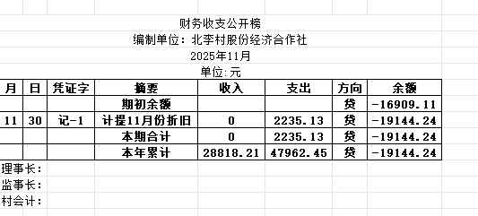 阿城镇北李村2025年11月份账目收支明细表
