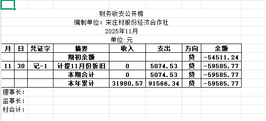 阿城镇宋庄村2025年11月份账目收支明细表