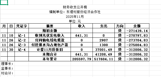 阿城镇东堤村2025年11月份账目收支明细表