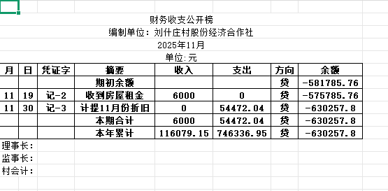 阿城镇刘什庄村2025年11月份账目收支明细表