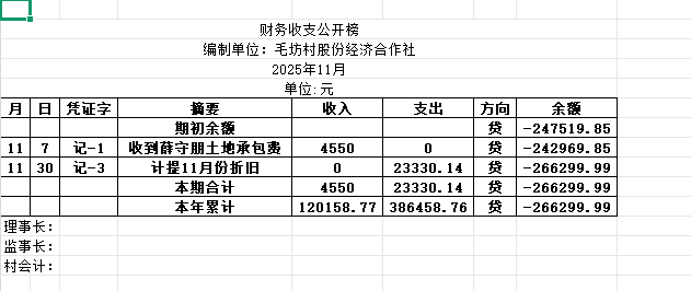 阿城镇毛坊村2025年11月份账目收支明细表