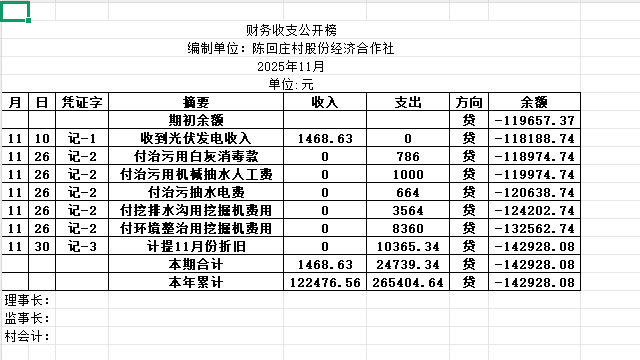 阿城镇陈回庄村2025年11月份账目收支明细表