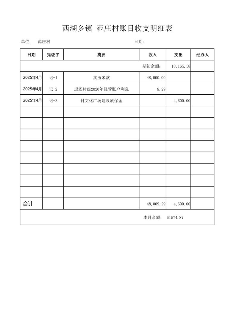 2025年4月份西湖镇范庄村账目收支情况表