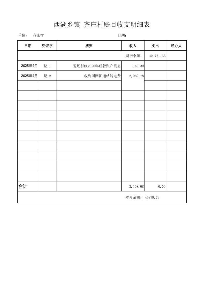 2025年4月份西湖镇齐庄村账目收支情况表