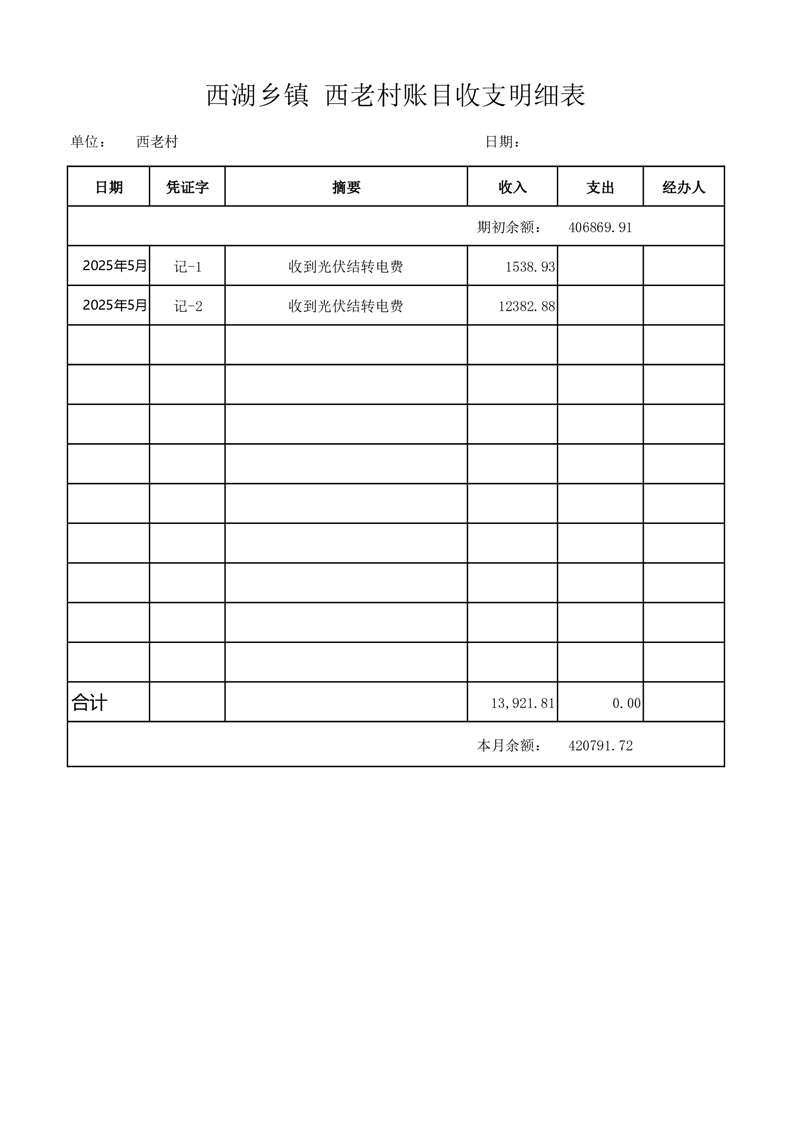 2025年5月份西湖镇西老村账目收支情况表